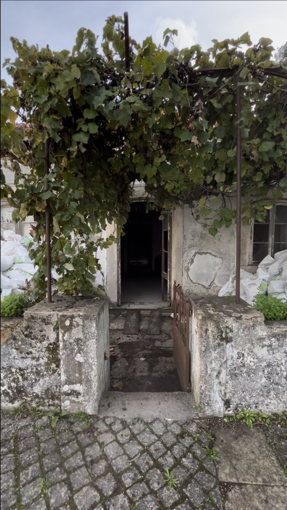 A segunda descoberta foi interna. À medida que portas e janelas se abriam, apesar do interior degradado, o exterior preservava uma envolvente rica e surpreendente. Paisagens de campo, árvores, flores e uma parreira centenária compõem um cenário natural que valoriza a propriedade. Foi ali, naquele contraste entre o abandono e a vida que seguia lá fora, que confirmou-se o verdadeiro potencial da casa: uma alma adormecida, rodeada por beleza e promessas.